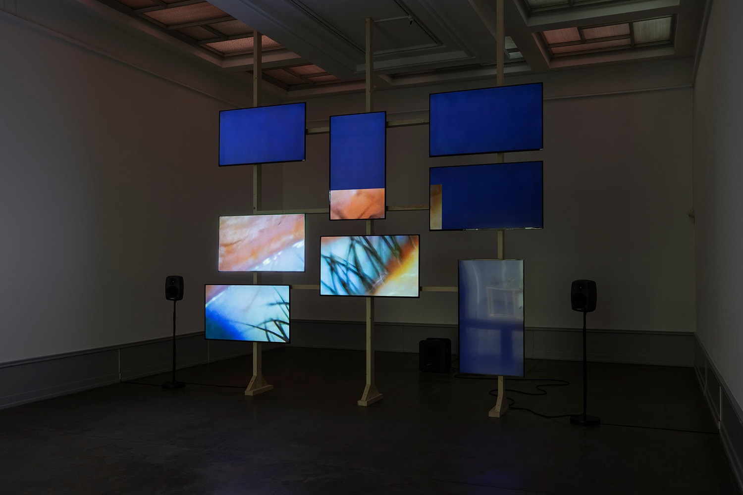 Klikk for å “bla” i visualisering av 8-kanals videoinstallasjon på videovegg i rommet (over)
