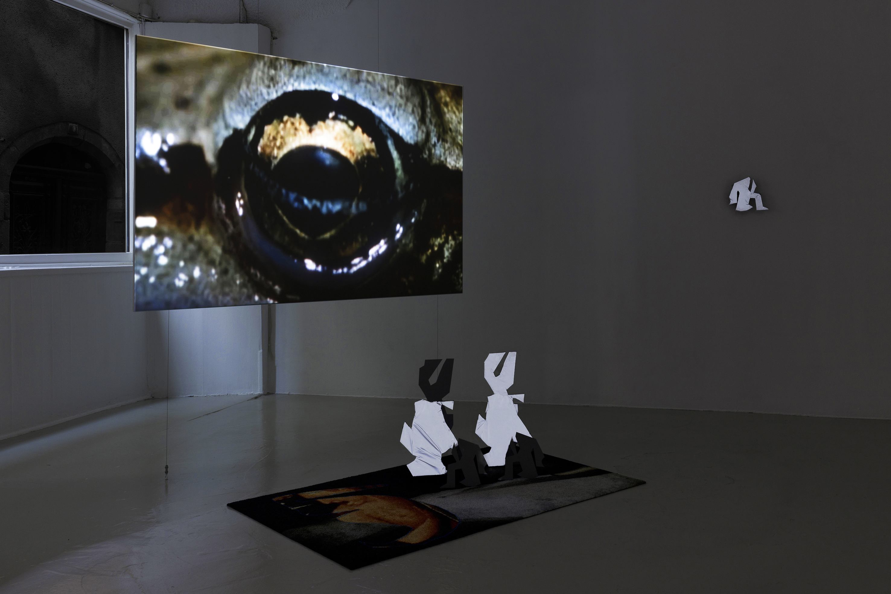 Videoinstallasjon med tepper, skulpturer, fargepigment, presenning